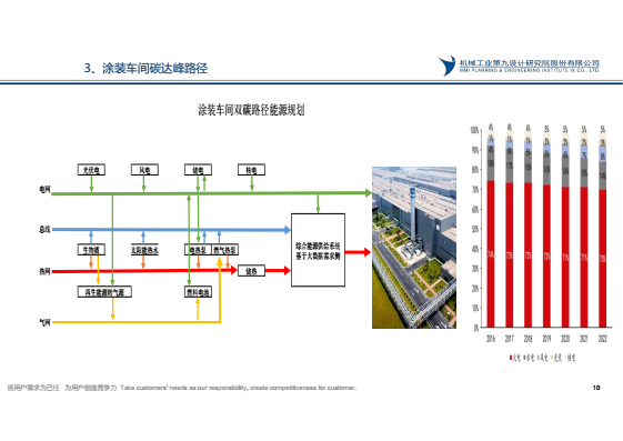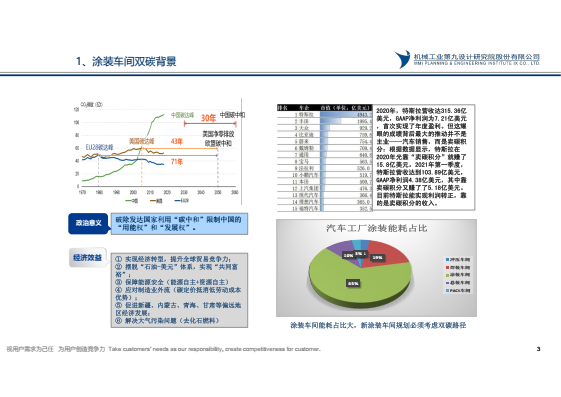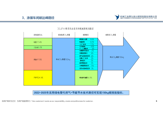 國務院20211024日頒布《2030年前碳達峰行動方案》,到2025年,非化石能源消費比例達到20%左右,單位國內生產總值能源消耗比2020年下降13.5%,單位國內生產總值二氧化碳排放比2020 年下降18%,目前汽車涂裝車間化石能源消費比約占80%,碳排放約占汽車工廠65%,汽車工廠實現碳達峰,涂裝需先行。