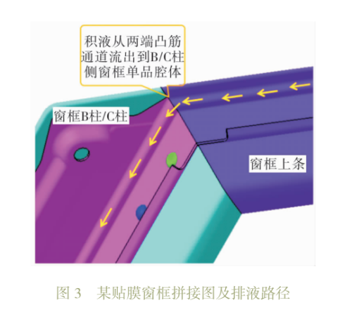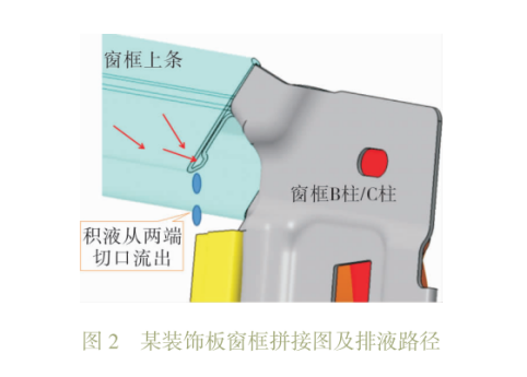 圖 2 為某裝飾板窗框拼接圖,其窗框上條兩段鋸切口外露(不與 B/C 柱飯金拼接)已有效形成排液口上條腔體積液可從圖示路徑排出;圖3為某貼膜窗框拼接圖,其街框上條兩段鋸切口必須與B/C 杜完全拼接,積液無法直接向外排出.必須與 B/C 柱飯金形成內部的排液通道,經 B/C 柱內腔往車門腔體排液。