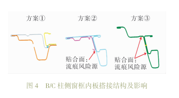 圖 4 B/C 柱側窗框內板搭接結構及影響
