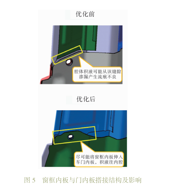 除此以外,方案D方案2結構下的窗框內板與車門內板的搭接關系對電泳流痕也有重大影響。如圖 5所示.B/C柱側的窗框內板如不延伸至車門內板內側,B/C 柱的積液在特定條件下將從修邊口處溢出流淌至車門內板區域,產生不必要的不良返修。如將 B/C 柱窗框內板延伸如車門內板內側,即使積液溢出也只是涉及車門腔體內.無需對應。
