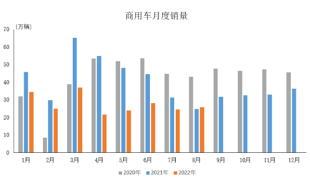 2022年8月,商用車產銷分別完成23.8萬輛和25.8萬輛,產量環比下降2.7%,銷量環比增長5.0%,同比分別增長3.1%和4%。 2022年1-8月,商用車產銷分別完成216.5萬輛和220.6萬輛,同比下降34.1%和36.2%。