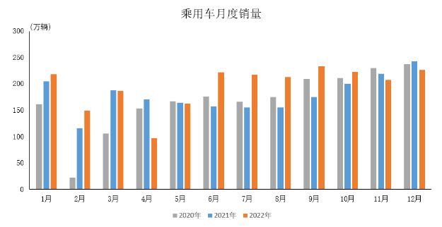2022年12月,乘用車產銷分別完成212.5萬輛和226.5萬輛,產量環比下降1.4%,銷量環比增長9%,同比分別下降16.1%和6.7%。
