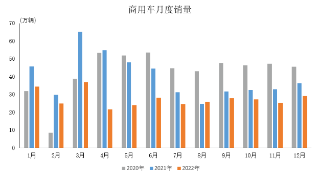 2022年,商用車產銷分別完成318.5萬輛和330萬輛,同比分別下降31.9%和31.2%,呈現兩位數下滑。