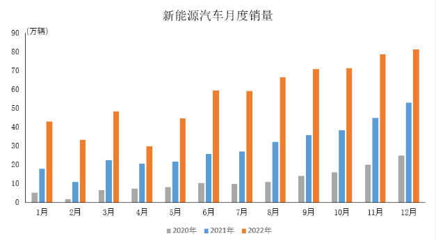 2022年12月,新能源汽車產銷繼續保持高速增長,再創歷史新高,分別達到79.5萬輛和81.4萬輛,同比均增長51.8%。