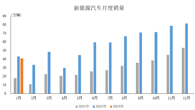 2023年1月,新能源汽車產銷分別完成42.5萬輛和40.8萬輛,環比分別下降46.6%和49.9%,同比分別下降6.9%和6.3%。