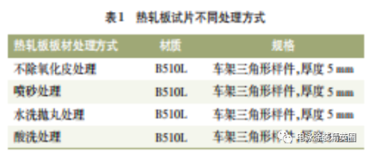 本次試驗選用重卡車架用板材,包含熱軋鋼板、車架三角形樣件,熱軋鋼板表面有一層氧化皮,對車架板材表面的氧化皮采用不同的處理方式:不除氧化皮處理、噴砂處理、水洗拋丸處理,酸洗處理等不同的表面處理方式,試片參數信息詳見表 1。
