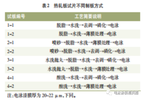 車架用熱軋鋼板采用不同的表面氧化皮去除工藝后,試板經過磷化和薄膜前處理兩種不同的前處理工藝方式,然后在實驗室進行陰極電泳泳板,制板信息詳見表 2。