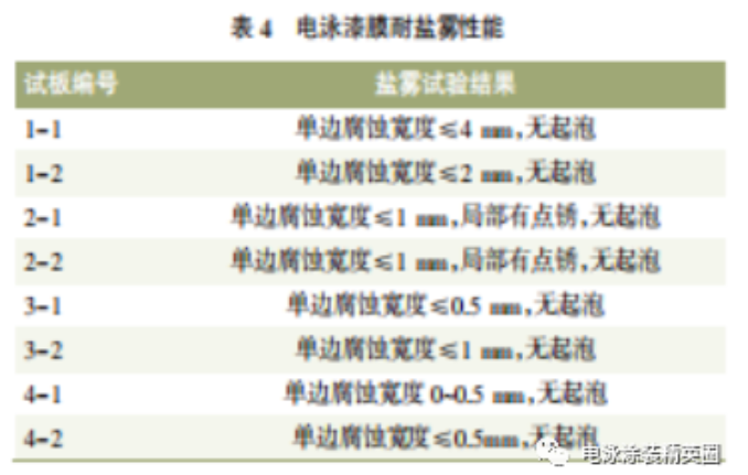 針對噴砂工藝,比較試板可得出,經過磷化前處理和無磷前處理的試板表面均存在點銹,對產生銹點的原因進行分析,可能是由于板材表面噴砂處理后,試板表面狀態一致性差。存在尖端效應,導致試板涂膜表面部分部位電泳涂膜偏薄,因而耐中性鹽霧試驗后試板出現銹點。噴砂后兩種前處理工藝處理的試板其擴蝕寬度均較小,耐腐蝕性能滿足產品要求。