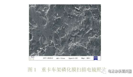 磷化膜的功能是提高涂覆在其上的電泳漆膜的附著力和耐蝕性,磷化膜結晶要求均勻致密,尺寸<8um,進一步分析磷化是否對電泳漆膜表面粗糙產生不良影響。采用車架縱梁沖孔邊角料在車架現場隨線制備了磷化膜,對磷化膜進行掃描電鏡 SEM 分析。掃描電鏡圖片如圖 1所示,發現磷化膜為粒狀,結晶均勻致密,結晶尺寸 2~3 um,成膜質量合格,均符合標準要求,未發生異常波動,故磷化膜質量不是車架電泳漆膜粗糙的主要原因。