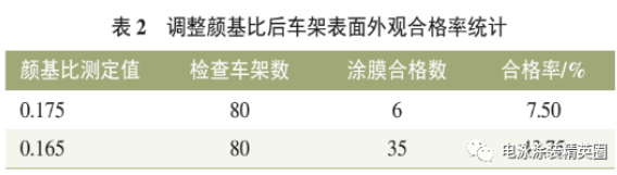 電泳涂裝的顏基比指電泳漆﹑槽液或漆膜中的顏料與基料(樹脂)之比,電泳槽液和新配的電泳原漆槽液顏基比應是相同的,但在電泳過程中,顏料和樹脂不一定按照原配比沉積到被涂物上,因而產生槽液、漆膜和原漆三者的顏基比不相同的現象,電泳槽液顏基比失調易產生縮孔、粗糙、失光等漆膜弊病,影響漆膜性能,因此需要定期檢測槽液顏基比,按檢測結果添加乳液或色漿調整槽液的顏基比。電泳槽液顏基比技術要求在0.14~0.20范圍內,按照Q/JQ 11219.4《涂料灰分、顏基比測定方法》進行檢測,顏基比雖在工藝要求范圍內,但是在明顯升高,通過調整顏基比范圍,使其降低至0.165左右,發現車架外觀糙合格率由7.5%提升至43.75%(見表2),故顏基比失調為電泳漆膜外觀的主要影響因素。