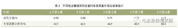 電泳槽液中的溶劑對電泳漆樹脂起助溶作用,助溶的過程分為滲透、溶脹、溶解 3 個過程,助溶作用的大小主要由助溶劑和電泳涂料樹脂的結構和極性等因素決定。溶劑可以提高電泳槽液的穩定性,溶劑的添加能夠促進電泳漆膜的流平性能,從而可提高電泳漆膜的外觀品質。溶劑還可以調節電泳涂膜厚度,不同類型的電泳漆有其適應的助溶劑,且助溶劑的組成、配比都需要在一定的范圍內,只有這樣才能保證電泳漆膜有持久穩定外觀質量。車架現場電泳槽液溶劑含量要求在0.5%~1.5%范圍內,按照 Q/JQ 11219.10《電泳涂料溶劑含量測定方法》進行檢測,結果見表 3。結果顯示電泳槽液溶劑含量偏低,提高溶劑含量可以一定程度降低外觀不良的發生率,故溶劑含量低為影響因素。