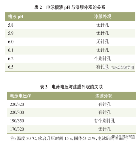 檢測結果顯示電泳槽槽液參數正常,均在管控范圍之內,在實驗室用現場槽液進一步驗證槽液的 pH及電泳電壓與漆膜外觀的關系,結果表 2~3。