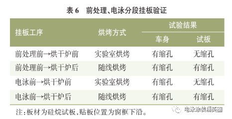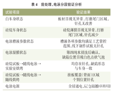 當電極開始通電時,首臺車身后蓋與第二臺車身的前圍同時面對距離相同電泳漆,而該區域由于車身泳動循環相對較差,非常容易發生陽極化,針孔很容易出現。前處理、電泳分段驗證分析見表 4。