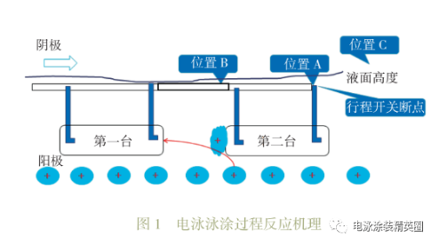 現場采用“全浸通電,斷電出槽”工藝。連續過車時,第一臺車在位置 A 斷電出槽時,第二臺車依然處于通電狀態,第一臺車尾門附近位置陽極(屬A 工位)處于工作狀態,導致第一臺車尾門附近位置出現“(陽)極化”異常。車身鋼板電解水,產生H?離子,腐蝕已經生成的電泳濕膜,并存在影響槽液穩定性的潛在風險。