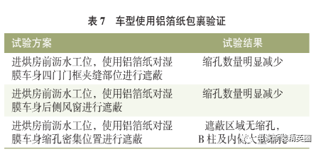 車型鈑金夾縫及外觀縮孔位置使用鋁箔紙進行遮蔽驗證,確認縮孔缺陷發生原因,結果見表 7。