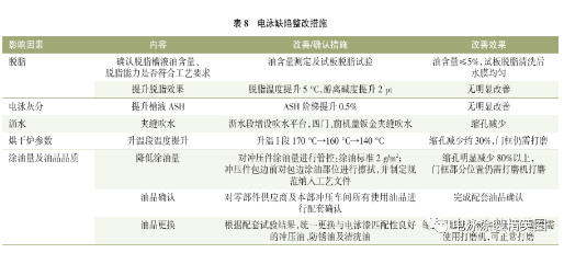 電泳缺陷整改措施及結果見表 8,改善效果:引擎蓋平面縮孔由 40個降至7個,四門門框縮孔由 25.8個降至8個。