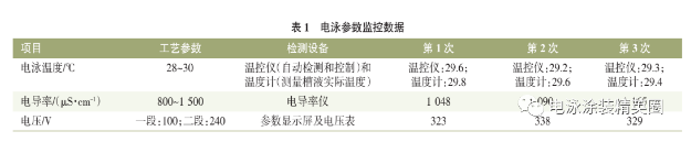 為了確定以上因素對漆膜的影響,在現場進行跟蹤排查,每隔 2 h 記錄相關數據,監測結果見表 1。通過監測發現電泳電壓參數存在異常,電泳電壓工藝設置參數與當前實際電壓不符,波動較大。