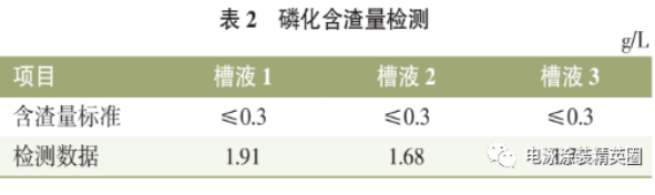 從表 3 可知,槽液工藝參數正常,可排除槽液參數影響,需進一步排查磷化除渣效率。