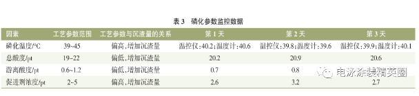 從表 2可知,磷化液中的含渣量超標,證實了當初猜想。而槽液磷化渣含量高低一般與溫度、總酸度、游離酸度、促進劑濃度、除渣效率有關。連續跟蹤 3 d,監測和化驗磷化液參數,見表 3。