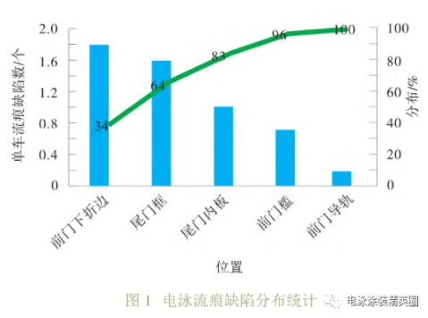 從2021年1月項目開始,涂裝車間E車型車身上有多處流痕,電泳流痕單車缺陷數達 5.3 個,主要集中在前門下折邊、尾門框和尾門內板等部位,占比83%,嚴重影響后工序的質量輸出,如圖1所示。