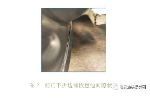 經過前兩輪的改善后,團隊發現,涂裝生產線現場調整效果不佳,因此將目標放在車門本身上面。經觀察,流痕主要集中在左右前門下折邊前段,此處包邊存在明顯間隙,可以插入一張白紙。經測量對比發現,前門下折邊后段包邊間隙<0.08 mm,前門下折邊前段包邊間隙都在 0.1 mm 以上,根據實際的流痕狀態,將原因鎖定在前門下折邊前段包邊間隙上,如圖2所示。