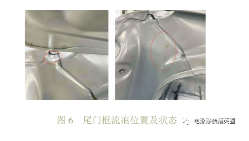 經現場觀察統計,尾門框流痕主要有 2 處,一處是頂蓋流水槽后端流出,另一處是尾門框焊縫流出,單車流痕缺陷數高達 1.6個,其中頂蓋流水槽后端流痕 0.6個,尾門框焊縫流痕1個,如圖 6 所示。