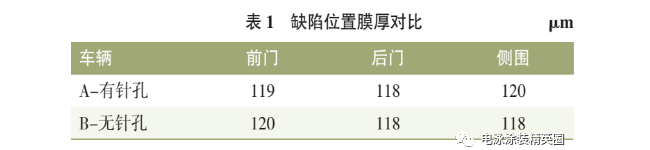 漆膜越厚,溶劑、水分或空氣越不容易揮發,在烘烤受熱過程中越容易頂破漆膜,形成針孔。現場選擇有針孔缺陷與無針孔缺陷各一臺車輛,且確保同顏色同款車輛,并對缺陷位置膜厚進行測量對比,結果見表 1所列。